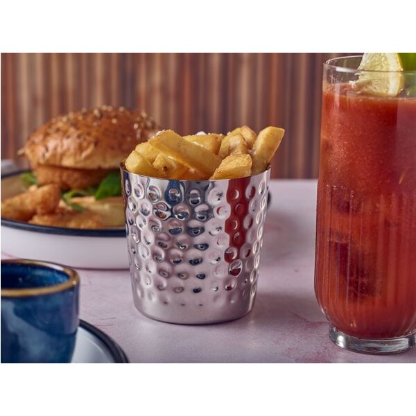 Genware Hammered Serving Cups are perfect for serving drinks, appetisers, and sides like fries and onion rings, delivering and authentic gastro-pub aesthetic. These versatile cups can be used alone or with greaseproof paper.