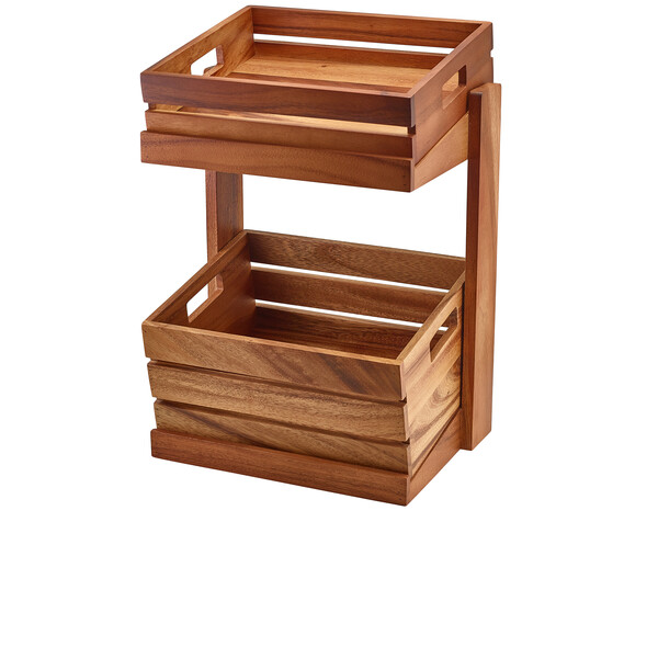The GenWare Acacia Wood Crate Stand brings together rustic charm and practical design, making it ideal for stylish food presentation in hotels, cafes, and buffet settings. Crafted from durable acacia woodwith a rich natural grain, this two tier stand is designed to hold GN 1/2 crates , offering a flexible and organised way to display baked goods, fresh produce, or grab and go foods. Its GN 1/2 footprint ensures easy integration with other GN compatible buffetware, delivering a consistent and professional presentation.