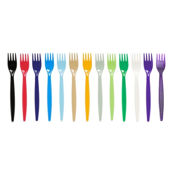Standard size fork made from virtually unbreakable and reusable polycarbonate plastic.